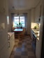 Köket är hemtrevligt med vita klassiska luckor och gott om förvaringsutrymme. Bänkskivan är i metall och i laminat. Här ryms en matgrupp för cirka fyra personer, perfekt för både vardagsmiddagar och sociala stunder.