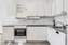 Stort kök med mycket förvaring. Vita skåpluckor. Matplats för 4-6 personer. Den maskinella utrustningen består av kombinerad kyl/frys, spis, ugn och diskmaskin.