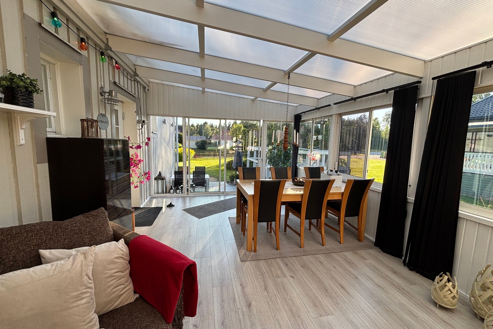 Trädgården är välplanerad, lummig och trivsam med ett inglasat uterum vid entrén där nuvarande ägare sitter från tidig vår till sen höst.