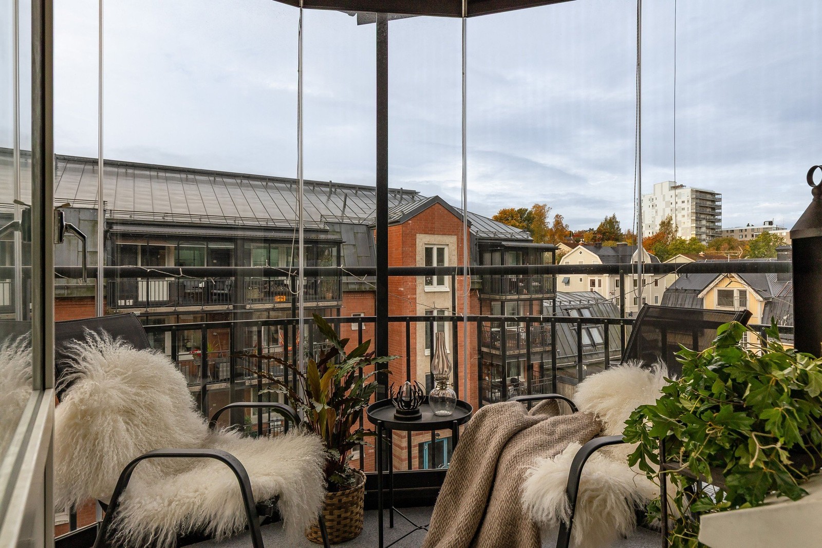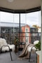 Inglasad balkong med solgardiner och el-utag.