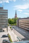 I anslutning till köket finns vardagsrum som rymmer både soffa och matbord, fint ljusinsläpp av stora fönster och fransk balkong. Härifrån har man fin utsikt mot Gustav Adolf kyrkan.