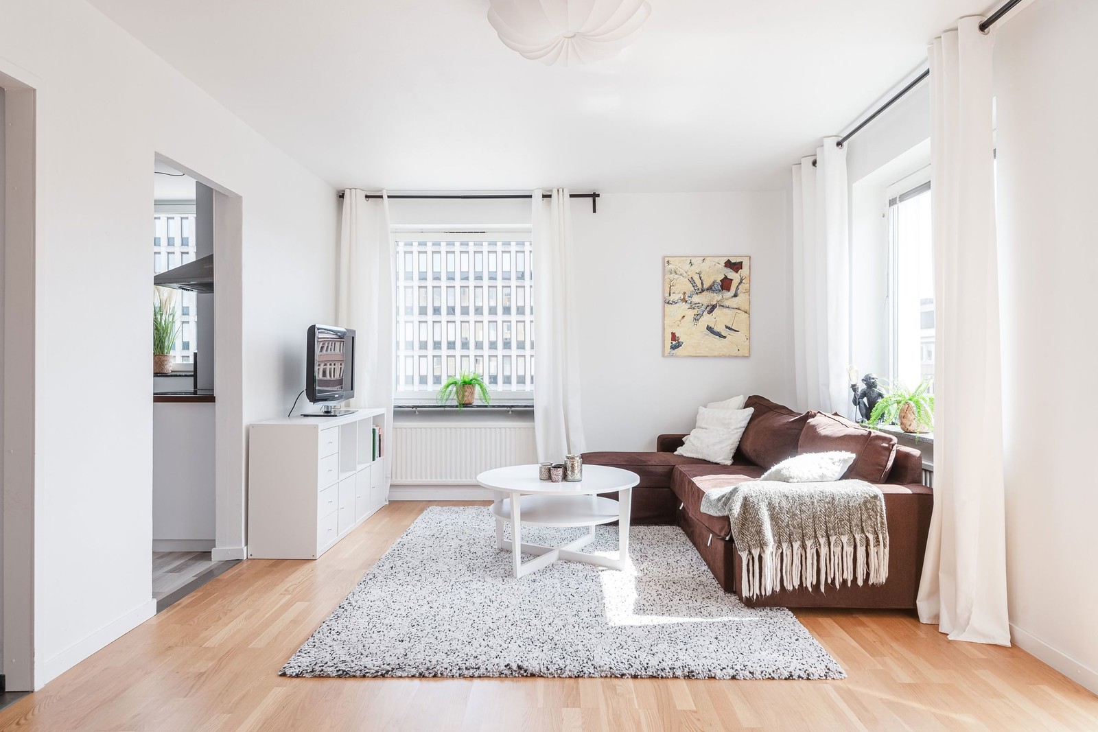 I anslutning till köket finns vardagsrum som rymmer både soffa och matbord, fint ljusinsläpp av stora fönster och fransk balkong. Härifrån har man fin utsikt mot Gustav Adolf kyrkan.