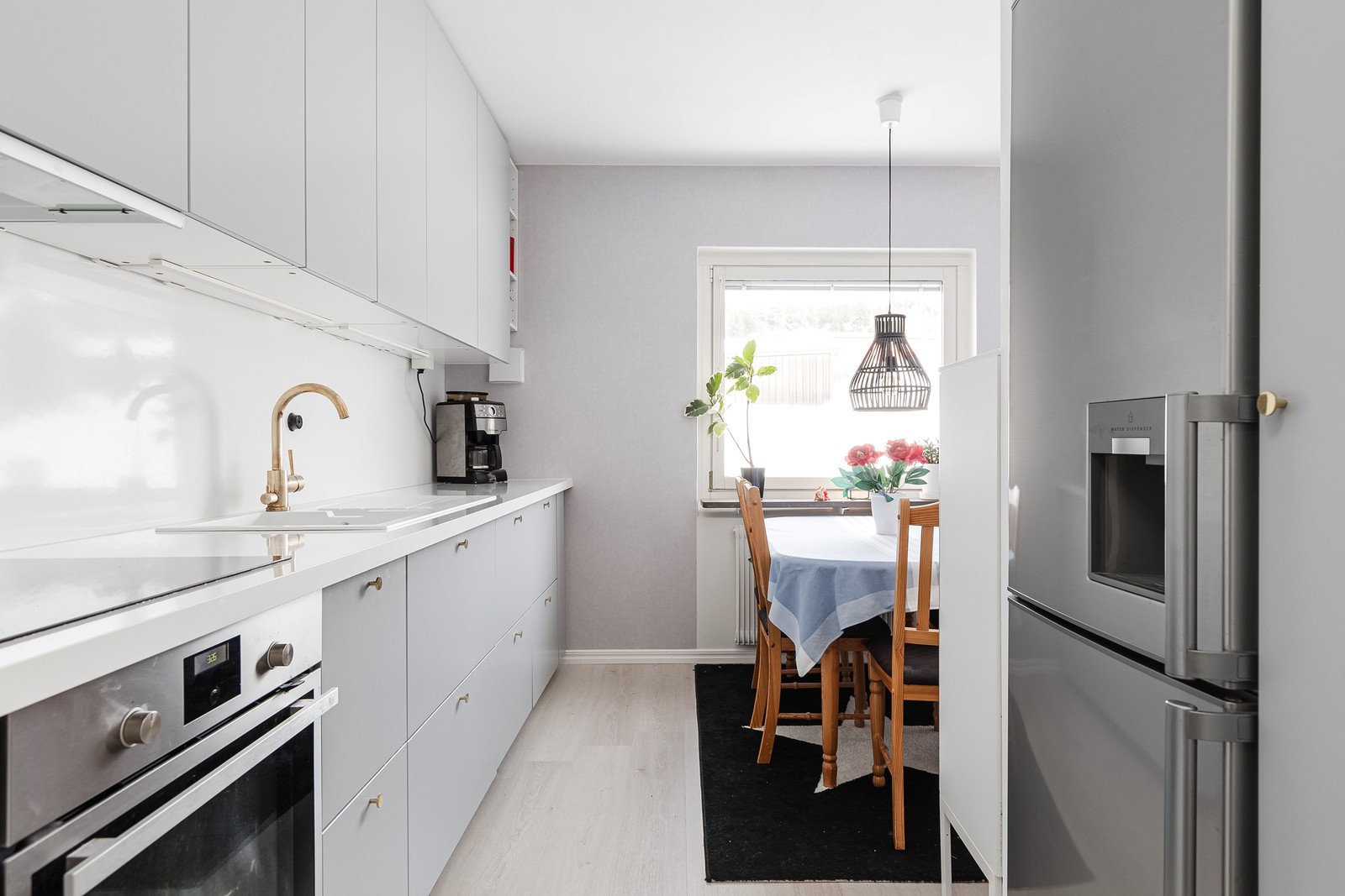 Välkommen till denna trevliga tvåa en halv trapp upp. Köket är renoverat år 2017 med gråa skåpluckor. Stort vardagsrum som rymmer både soffa och matbord, härifrån når man den inglasade balkongen. Badrum med dusch. Bostaden har bra förvaringsmöjlighet av skjutdörrsgarderob i hall och sovrum.