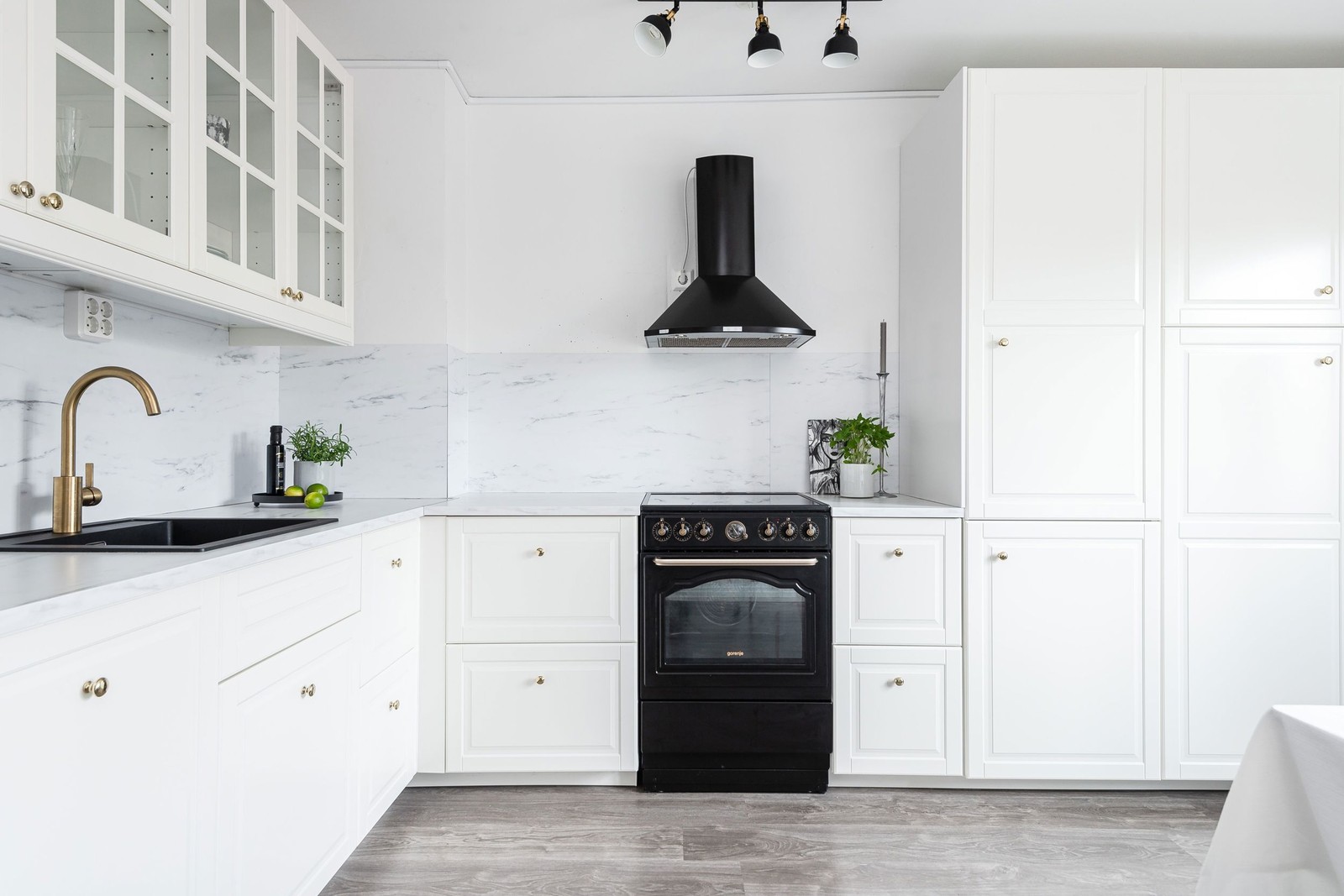 Ljust och tilltalande kök från IKEA. Här finns fina vitrinskåp där du kan ställa fram ditt favoritporslin samt vita praktiska skafferilådor. Köket är utrustat med induktion, fläkt, integrerad diskmaskin samt integrerad kyl/frys. Här finns goda bak- och matlagningsytor samt goda förvaringsytor. I köket får du plats med stor matbord om ca 6-8 stolar. Laminatgolv.