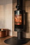 Stugan har ett högt och soligt läge och rymmer arbetskök i öppen planlösning mot matplats och allrum. De stora fönsterpartierna släpper in rikligt med ljus och suddar ut gränsen mellan ute och inne. I allrummet skapar den vackra kaminen både värme och en extra mysfaktor under kyligare kvällar.