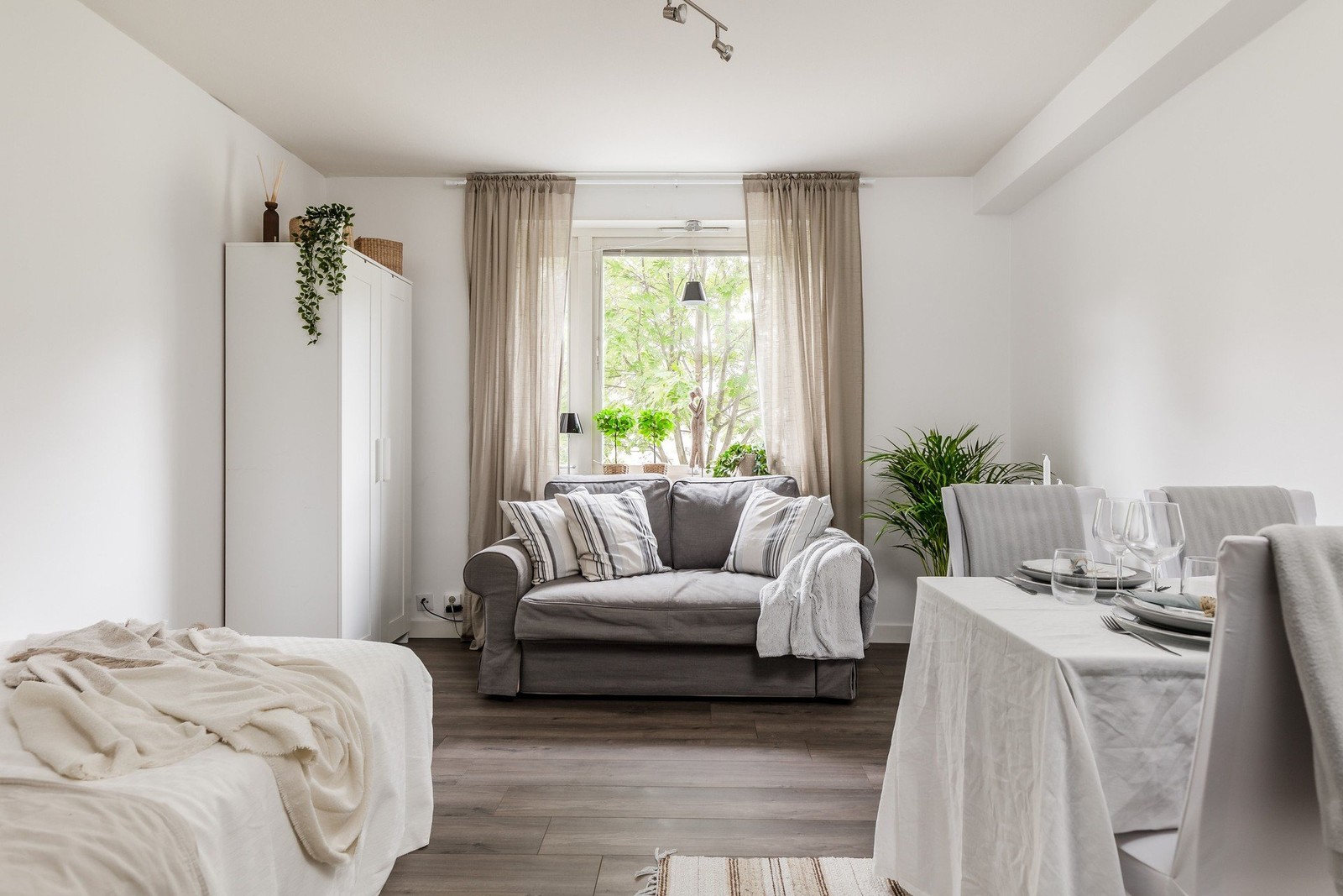 Ljust och fint allrum renoverat 2022 med fina laminatgolv och ljusa ytskikt. Här finns plats för säng och övrig möblemang.