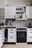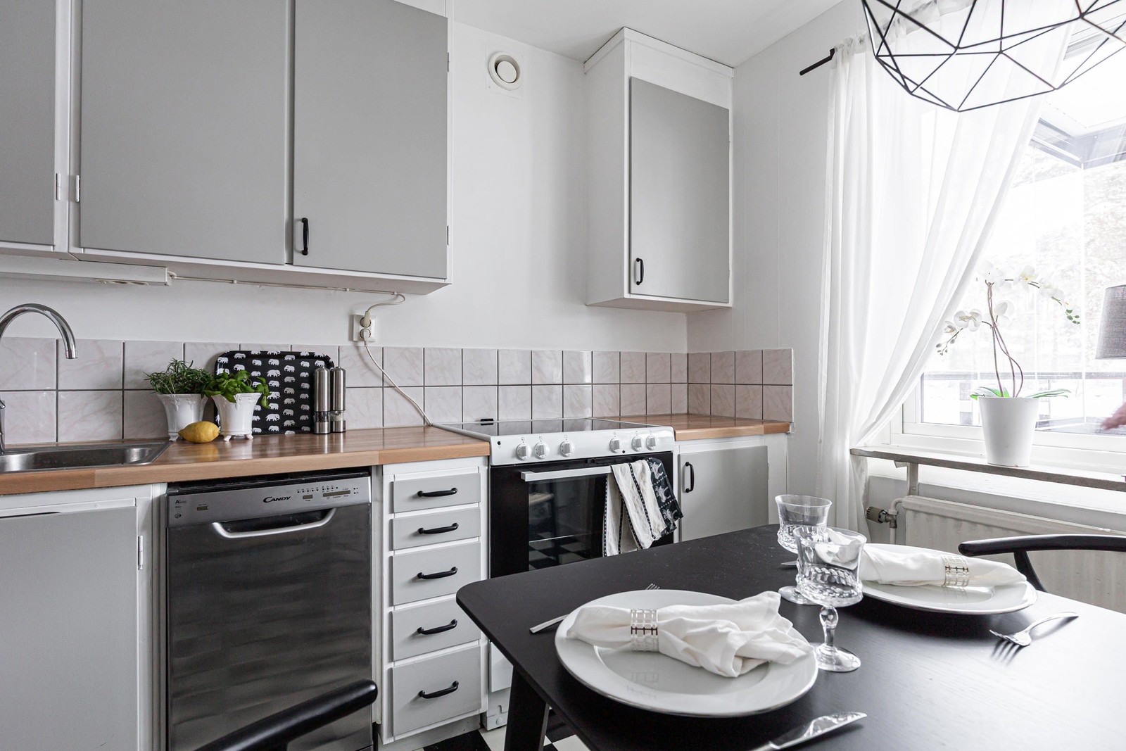 Praktiskt kök med matplats invid fönster. Den maskinella utrustningen består av spis/ugn, diskmaskin samt kyl/frys.