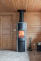 Stor och ljus matplats med gott om plats för stort matbord. Här erbjuds även spotlights med som skapar en härlig mysbelysning. Här finner vi även en praktisk, stilfull och effektiv vedkamin.