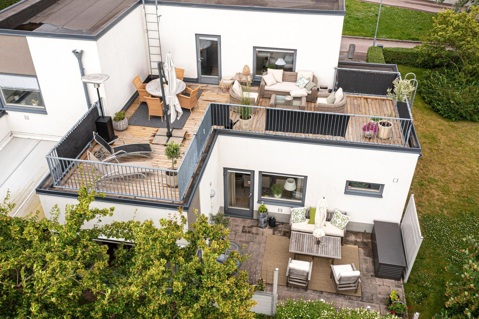 Hjärtligt välkommen till denna verkligt unika etagelägenhet om 127 kvm! Utsökt boende vilket karaktäriseras av magisk och väl tilltagen takterrass med grönskande utsikt samt tidlöst kök med utgång till stenbelagd uteplats. Underbart vardagsrum med generösa sociala ytor samt utgång till ytterligare magisk och privat uteplats. Entréplan erbjuder även rogivande och väl tilltaget sovrum samt estetiskt tilltalande badrum med tvättmaskin och torktumlare. Övre plan med två väldisponerade sovrum, ytterligare elegant badrum samt klädkammare. Exemplarisk förvaring via förråd i direkt anslutning till egen entré. Sammantaget ett fantastiskt boende med genomgående mycket hög fräschör.
