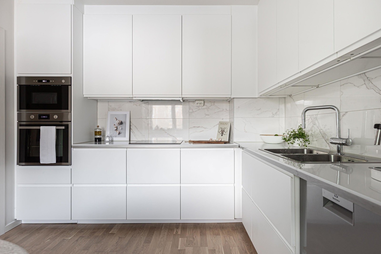 Redan i entrén möts du av en varm och exklusiv känsla med stilrena materialval. Hallen präglas av ett elegant marmorliknande golv och erbjuder en naturlig siktlinje in mot det ljusa och smakfulla IKEA-köket, som kombinerar funktionalitet med en lyxig touch.