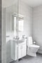 Rymligt helkaklat badrum med vitt kakel och grått klinker. Utrustning i form handfat med kommod, spegelskåp, duschkabin, tvättmaskin, handdukstork samt WC. Naturligt ljusinsläpp via fönster.