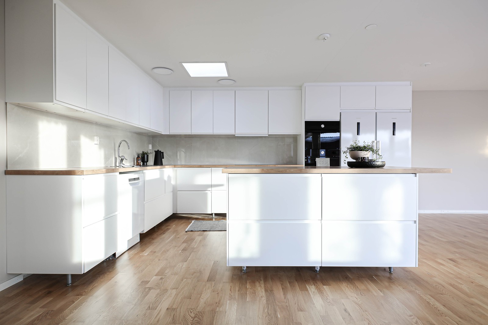 Öppen planlösning mellan vardagsrum och kök. Vitt kök med stor härlig köksö. Ljust kakel ovan arbets- samt avlastningsytor. Full utrustat med spis/ugn, spisfläkt, diskmaskin samt kyl/frys.