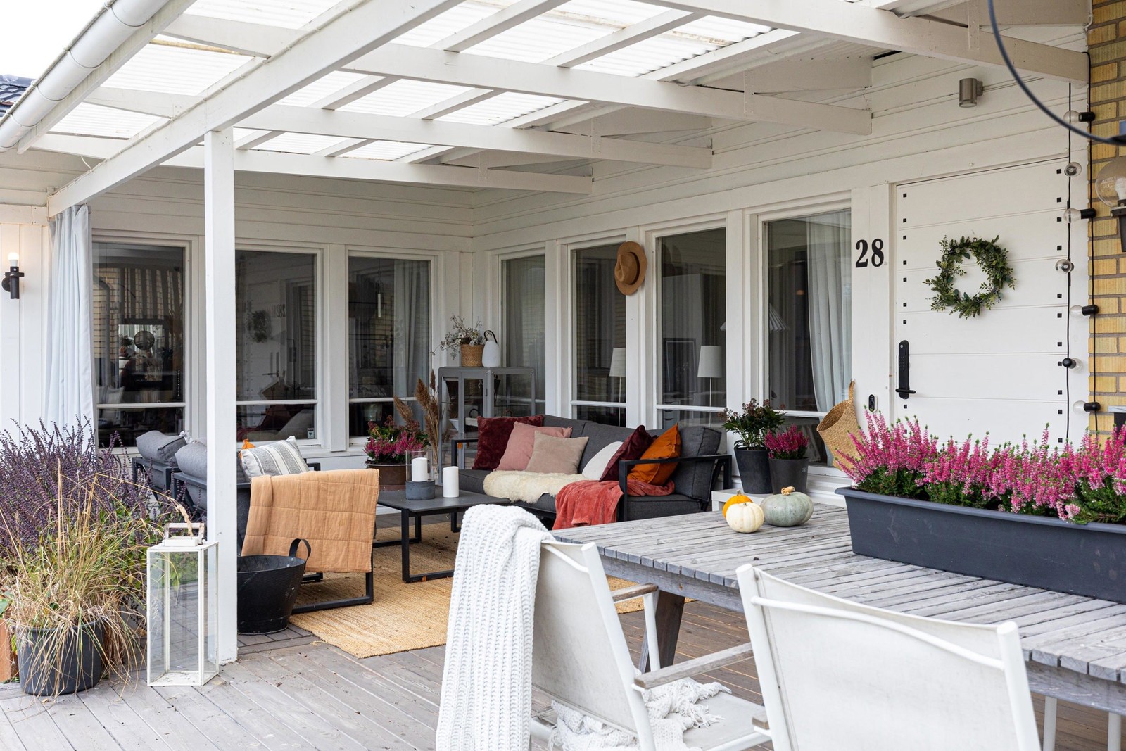 Välkomnande hall med goda förvaringsmöjligheter och direkt access till en rymlig matplats eller extra allrum. Arbetskök med trärena luckor delvis målade i grått och utrustat med kyl/frys, diskmaskin, spishäll, fläkt, inbyggd ugn och mikro. Från köket nås en stor inglasad altan med högt och fint läge – perfekt för långa sommarkvällar.