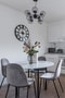 När du kliver in möts du av ett luftigt vardagsrum som harmonierar med köket, där stora fönsterpartier släpper in rikligt med dagsljus och skapar en trivsam atmosfär. Köket är utrustat med moderna vitvaror och generösa arbetsytor som gör matlagningen till ett nöje. Intill finns en rymlig matplats där du kan njuta av middagar med nära och kära.