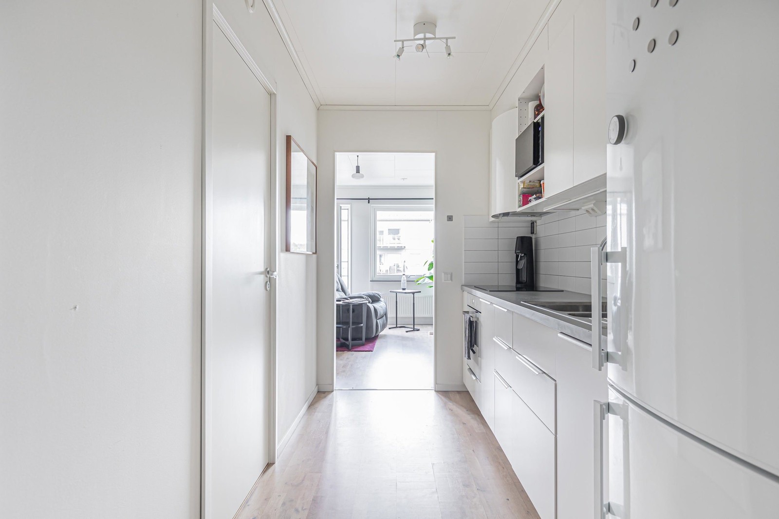 Vidare i lägenheten finner ni det stilrena och praktiska köket med gott om förvaring bakom vita skåpluckor. Goda arbets- samt avlastningsytor med ovansittande vitt kakel. Maskinell utrustning bestående av häll, inbyggnadsugn, köksfläkt samt kyl/frys.