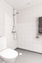 Välkomnande hall med plats för avhängning av ytterkläder. I direkt anslutning till hallen återfinns det rymliga badrummet med helkaklade väggar samt våtrumsmatta på golv. Utrustning i form av dusch, handdukstork, handfat med tillhörande kommod, spegelskåp, tvättmaskin samt WC.