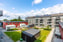 Miljöhus för sophantering. Grönskande innergård med växthus, grillplats, pergola, lekyta och odlingslådor.