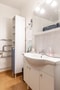 I anslutning till hallen återfinns ett badrum med ljusa väggar och våtrumsmatta golv. Utrustat med handfat, kommod, spegelskåp, högskåp, handdukstork, WC, och duschhhörna.