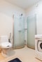 I anslutning till hallen återfinns badrum med våtrumsmatta samt kaklade/målade väggar i ljus kulör. Utrustat med handfat med tillhörande kommod, spegel, handdukstork, WC och dusch.