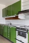 Kök med plastmatta och tapetserade väggar. Goda förvaringsmöjligheter bakom gröna skåpluckor. Vitt kakel ovan arbets- samt avlastningsytor. Den maskinella utrustningen består av kyl, frys, spis och fläkt. Här ryms matplats intill fönster.