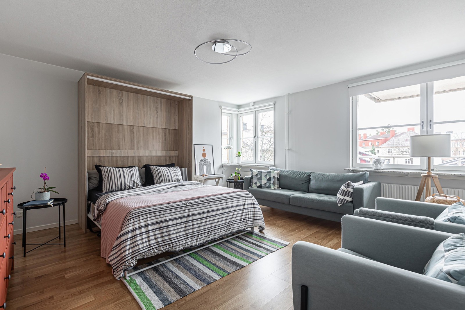 Rum: Det stora rummet upplevs som stort och luftigt. Här omfamnas vi av ett härligt parkettgolv, ljusa väggar och fint ljusinsläpp från härliga fönsterpartier. Detta sammanslaget skapar en härlig inbjudande känsla i hela rummet. Ett mycket välkommet inslag är sängskåpet (kommer lämnas kvar vid tillträde). En mycket praktisk lösning som gör att man kan nyttja rummet som ett vardagsrum under dagtid och som ett sovrum under kvällstid. Helt enkelt det bästa av två värdar!