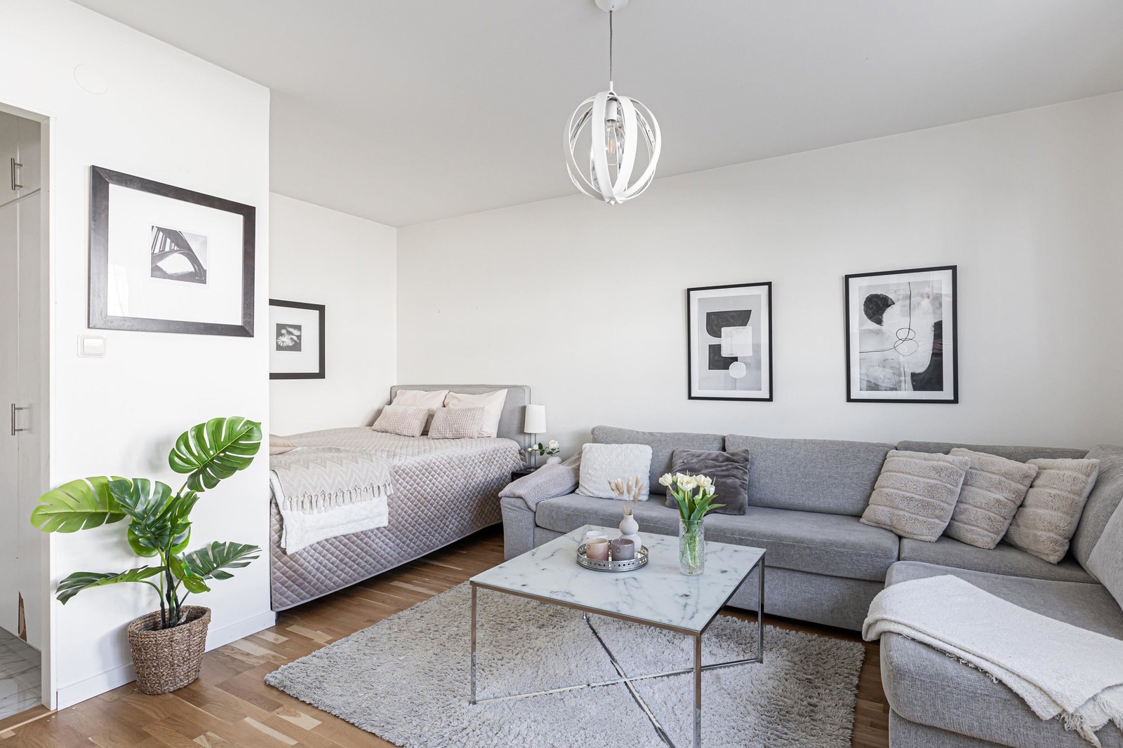 Väl tilltaget allrum med smart planerad sovalkov. Här fås plats med sedvanligt möblemang. Generöst ljusinsläpp via dubbla fönsterpartier. Ytskikt i form av ljust målade väggar samt parkettbelagt golv.