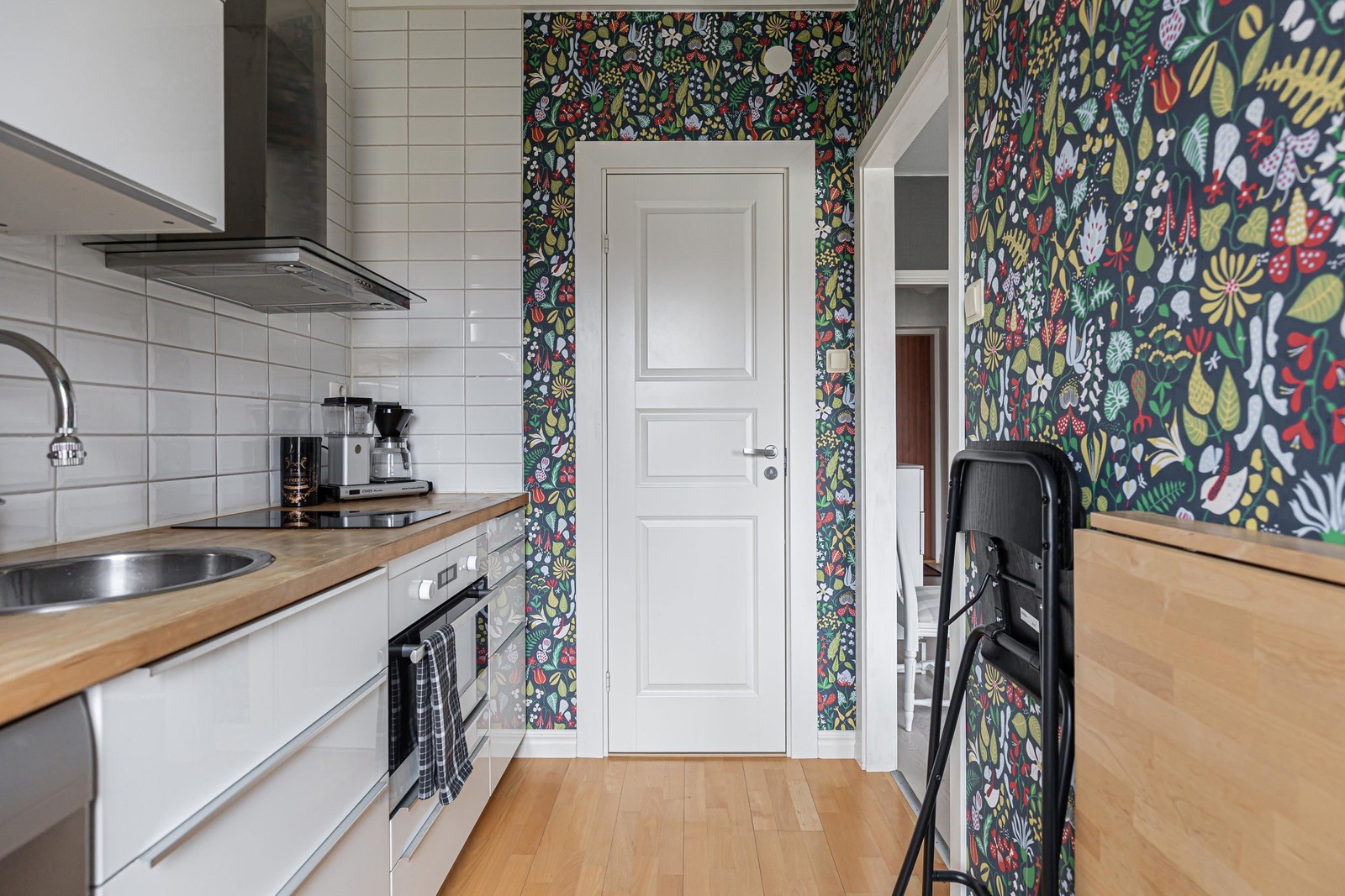 Stilrent och praktiskt kök med goda förvaringsmöjligheter via vita skåpluckor. Goda arbets- samt avlastningsytor med ovansittande vitt kakel. Maskinell utrustning i form av häll, köksfläkt, inbyggnadsugn, diskmaskin samt kyl/frys. I direkt anslutning till köket återfinns det välplanerade badrummet med våtrumstapet och våtrumsmatta på golv. I övrigt utrustat med dusch, handfat, handdukstork samt WC. Badrummet är förberett för tvättmaskin.
