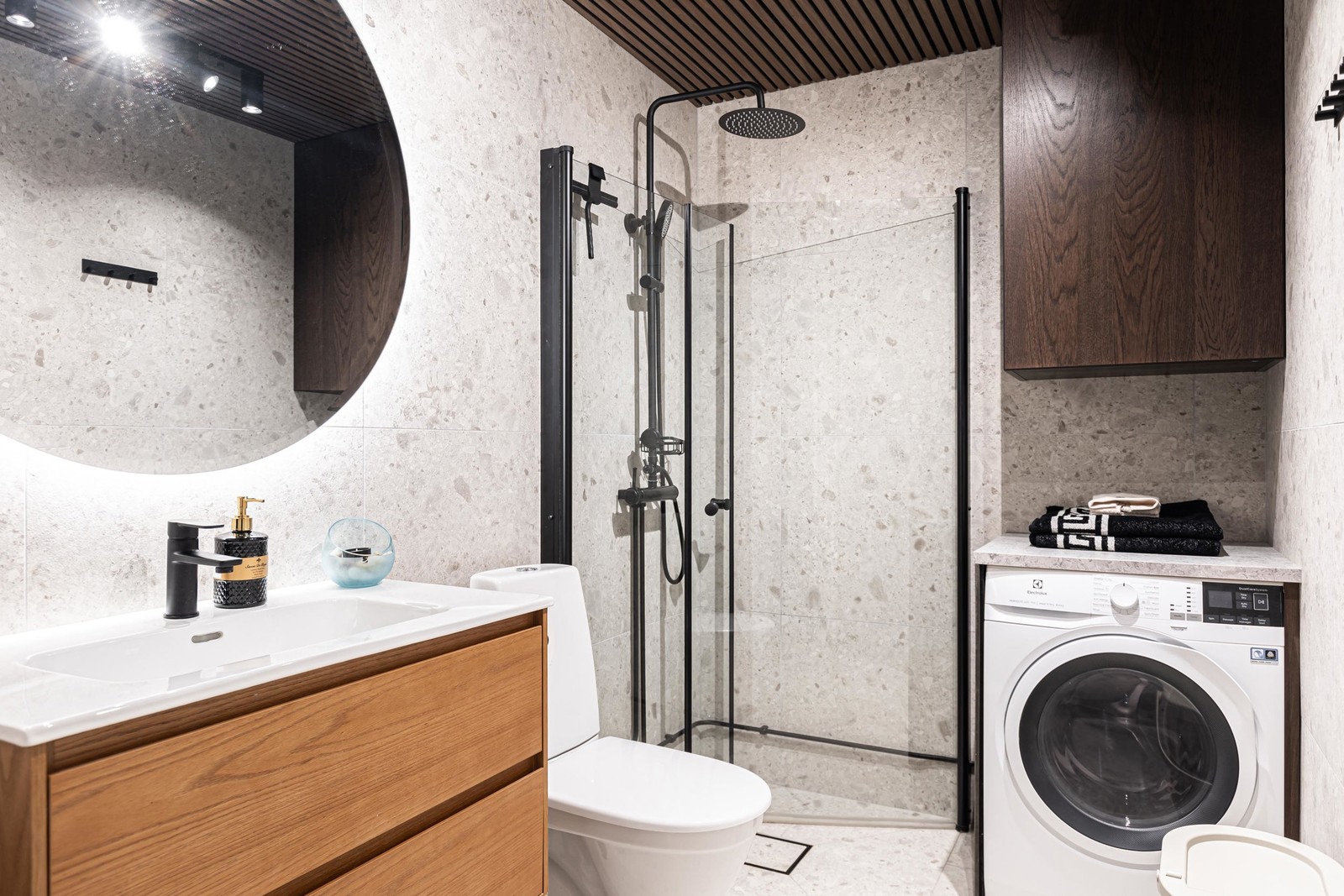 Modernt och välplanerat badrum med helkaklade väggar samt klinkerbelagt golv. Utrustning i form av dusch med vikbara duschväggar handfat med tillhörande kommod, kombinerad tvättmaskin med torktumlare (Samsung), överskåp samt WC.