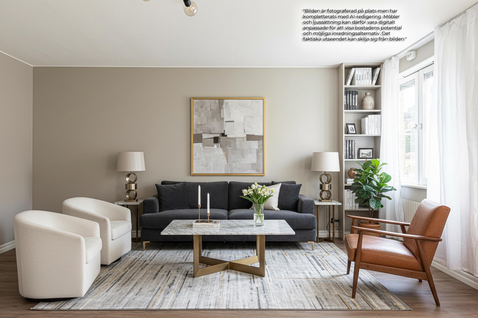 Vidare i lägenheten återfinns det väl tilltagna vardagsrummet med härligt ljusinsläpp via flertalet fönsterpartier. Här fås med enkelhet plats för sedvanligt vardagsrumsmöblemang samt matbord. Genomgående stilrena och fräscha ytskikt.