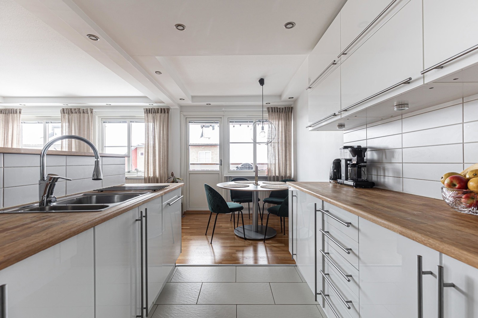I detta charmiga hem möts du av ett härligt kök med en delad planlösning mot det rymliga vardagsrummet. Här finns gott om plats för matlagning och umgänge. Ett perfekt rum för att skapa minnen och njuta av god mat tillsammans med familj och vänner.