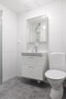 Badrum: Det nyrenoverade badrummet är stilrent inrett med grå klinkergolv och vita helkaklade väggar. Här finns dusch, handfat med kommod, spegelskåp, toalett samt handdukstork, en modern och praktisk helhet.