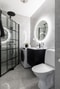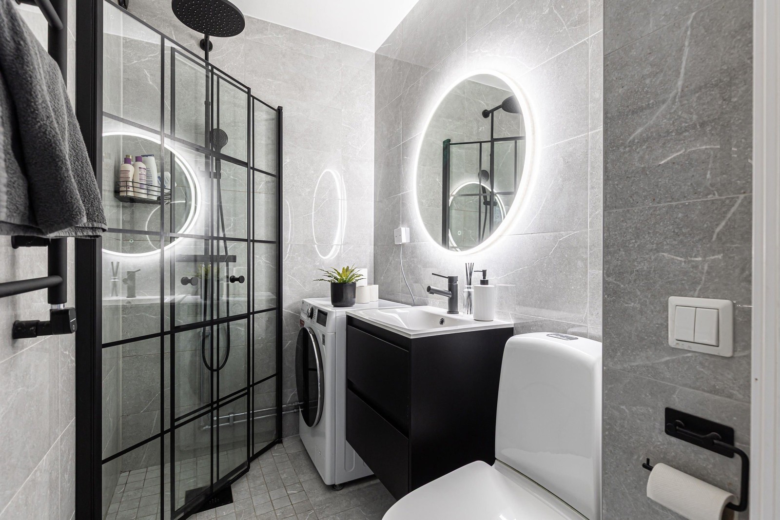 Välkomnande hall med exemplariska förvaringsmöjligheter via flertalet platsbyggda garderober. Ytskikt i form av klinkerbelagt golv samt ljust tapetserade väggar. I direkt anslutning till hallen återfinns det estetiskt tilltalande och helkaklade badrummet. Utrustning i form av dusch med vikbara duschväggar, handfat med tillhörande kommod, tvättmaskin samt WC.