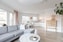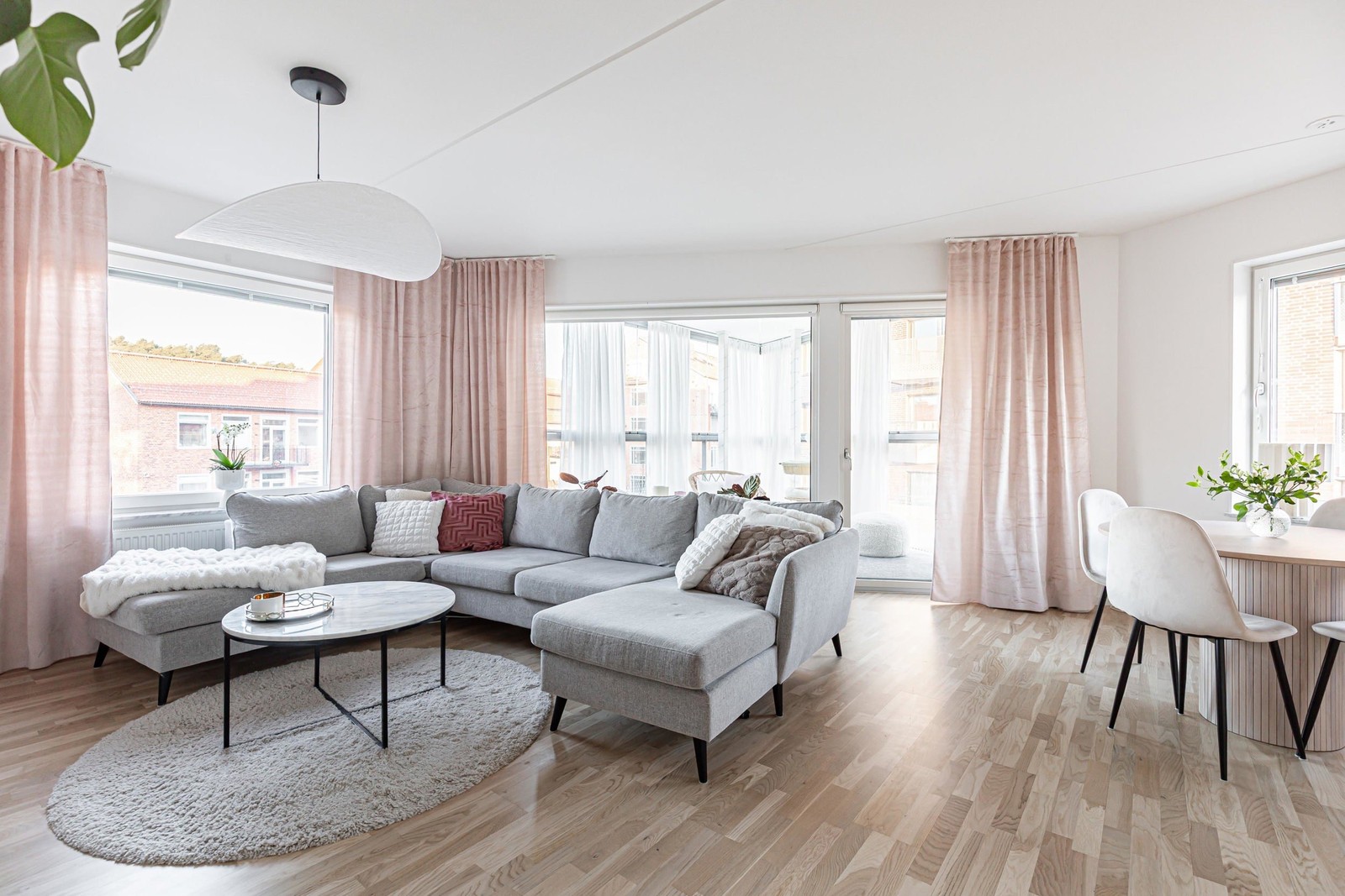 Vardagsrum med generöst ljusinsläpp från fönster i tre väderstreck. Parkettbelagt golv med ljusa omgivande ytskikt. Socialt öppen planlösning. Utgång till härlig och inglasad balkong (skjutbara glaspartier).