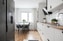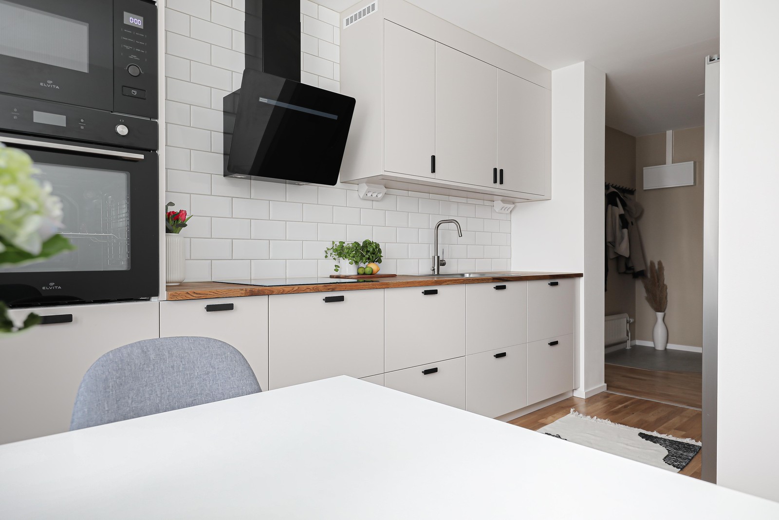Vidare in i lägenheten påträffas det rymliga köket med matplats intill fönster. Ombyggt 2022 med goda förvaringsmöjligheter bakom vita luckor samt stilrent vitt kakel ovan goda arbets- och avlastningsytor. Omgivande ljusa ytskikt samt parkettbelagt golv. Den maskinella utrustningen består av spishäll, spisfläkt, ugn, integrerad diskmaskin, microvågsugn samt kyl och frys.