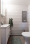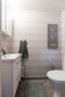Gäst-wc med wc, handfat med tillhörande kommod och spegelskåp över.