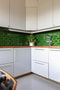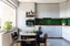 Entrén är utrustad med klinkersgolv och resterande av hall, kök samt vardagsrum är målat trägolv. Ljusa neutrala väggar. Sovutrymmet är belagt med härlig mattgolv för en trevligare känsla och avskärmas även med moderna glaspartier. Köket är fantastiskt inrett med IKEA-kök och grönt kakel. Bänkskiva i gediget trä. Vardagsrummet har en platsbyggd hylla längs ena väggen.