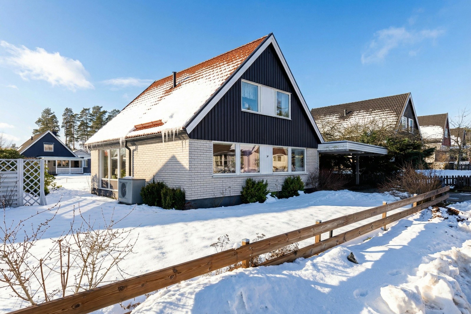 Här finns vidbyggt garage samt uppfart med carport och plats för två bilar, vilket ger både bekvämlighet och goda parkeringsmöjligheter. På baksidan väntar en trevlig uteplats, delvis under tak och en lättskött trädgård i bästa sydvästläge, idealiskt för lek, grillkvällar och sköna eftermiddagar i solen.