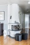 Kök: Ljust kök med öppen planlösning, parkettgolv och ljusa väggar. Köksinredning i ljus kulör med bänkskiva i trä. Utrustning i form av kyl, frys, spis och ugn allt från 2021. Köksö placerad mot väggen mellan kök och vardagsrum.