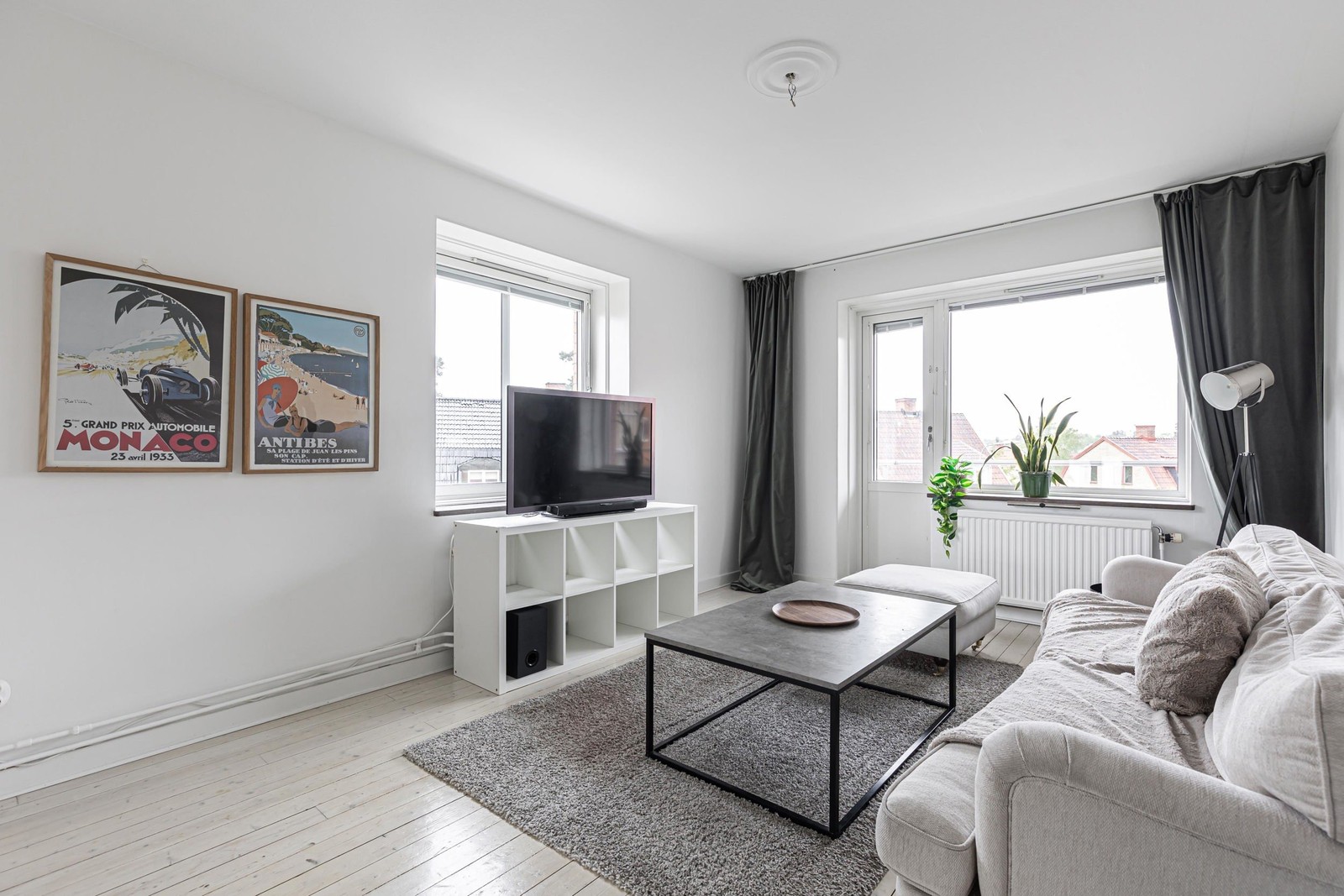 Väl tilltaget vardagsrum med vitmålade väggar samt trägolv. Här ryms sedvanligt vardagsrumsmöblemang samt matgrupp. Goda förvaringsmöjligheter via garderob. Generöst ljusinsläpp via fönster i två väderstreck. Härifrån finner ni även utgången till den rymlig balkong i västerläge med eftermiddags- och kvällssol.