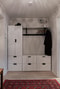 Hall med ljusa omgivande ytskikt och exemplarisk förvaring av ytterkläder via hallmöbel med hängare och skåp på vänster sida.