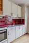 Lägenhetens kök i husets nordöstra hörn mot entrésidan är utrustat med ljusa äldre överskåp och vita kökssnickerier. Röda kakelplattor ovan bänk. Ytskikt utgörs av en ljus plastmatta och ljusa väggar. Maskinell utrustning i form av spis med ugn, spisfläkt med kryddhylla och kyl/frys. .