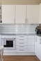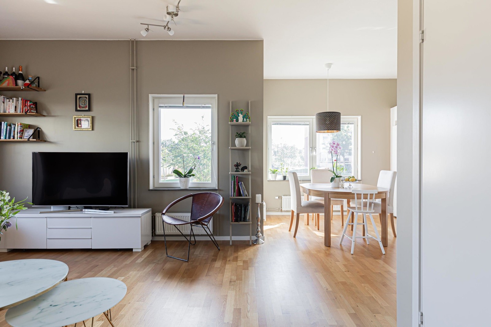 Den öppna planlösningen mellan kök och vardagsrum skapar en modern och inbjudande atmosfär. Genomgående neutrala färger och enhetligt golv i hela bostaden bidrar till ett harmoniskt och lättmöblerat hem.