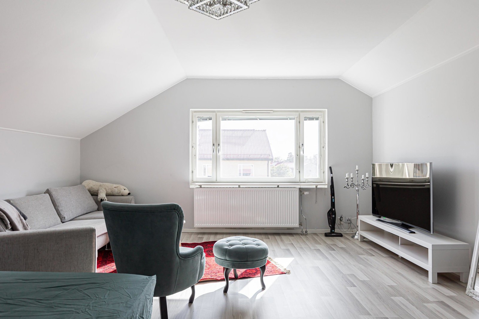 Det luftiga rummet med stort fönster ger en härlig rymd. Här ryms både dubbelsäng, soffhörna och matplats utan problem. En perfekt plats för både avkoppling och umgänge. Ytiskten består av vita målade väggar samt grått enhetligt laminatgolv.