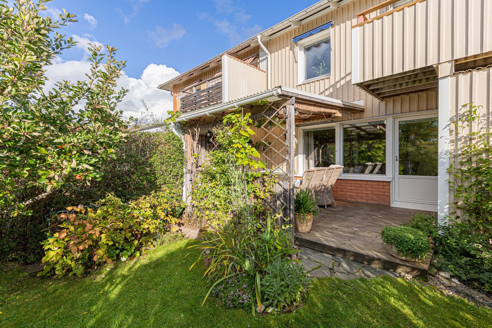 Friköpt, grönskande och insynsskyddad tomt. Trädäckad altan, delvis under tak. Förråd i anslutning.