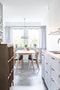 Estetiskt tilltalande kök med matplats intill dubbla fönster. Belysning via infällda spotlights, dimmerfunktion. Mycket god förvaring bakom ljusa släta luckor. Elegant kakel ovan arbets- samt avlastningsytor. Maskinell utrustning i form av spishäll, spisfläkt, diskmaskin samt fullstor kyl och frys. Skjutdörr mot vardagsrum.
