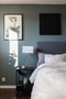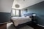 Rogivande sovrum som med enkelhet rymmer säng med tillhörande sängbord samt externa garderober. Grönt målade väggar samt laminatbelagt golv.
