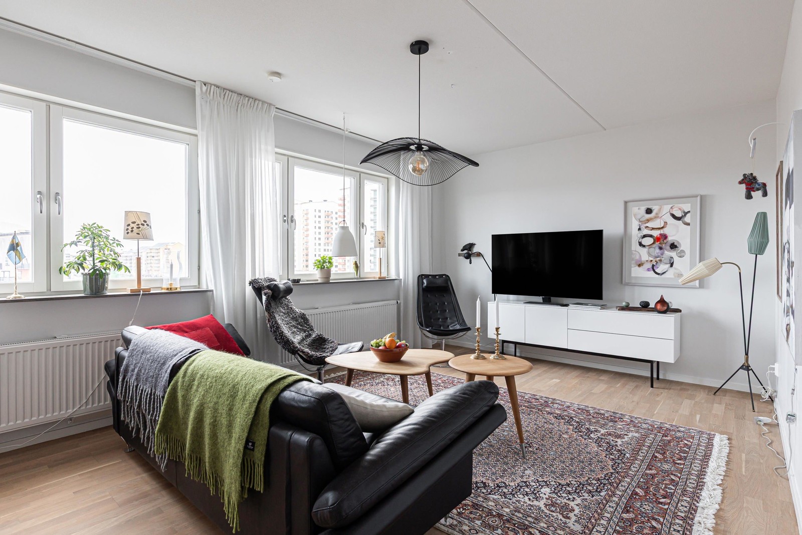 Lättmöblerat vardagsrum i perfekt avvägd öppen planlösning mot kök. Parkettbelagt golv, genomgående för lägenheten.