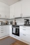 Stilrent och tidlöst kök med matplats intill fönster för 4-6 personer. Exemplarisk förvaring bakom vita släta luckor. Vitt kakel ovan arbets- samt avlastningsytor. Maskinell utrustning i form av spishäll, spisfläkt, inbyggnadsugn, inbyggnadsmikro, integrerad diskmaskin samt fullstor kyl och frys.