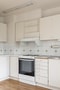 Kök med bra förvaring bakom vita skåpluckor och vitt kakel ovan arbetsytor. Utrustat med vitvaror i form av kyl/frys, spis samt fläkt. Matplats intill fönster.