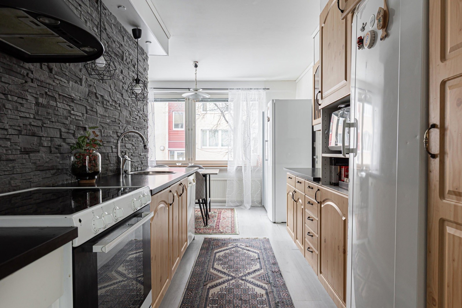 Bostaden erbjuder generösa ytor och ljusa ytskikt som skapar en luftig och trivsam atmosfär. Köket är smakfullt inrett med skifferimitation och köksluckor i trä som ger en varm och inbjudande känsla. Här finns gott om arbetsyta och förvaring för den matlagningsintresserade.